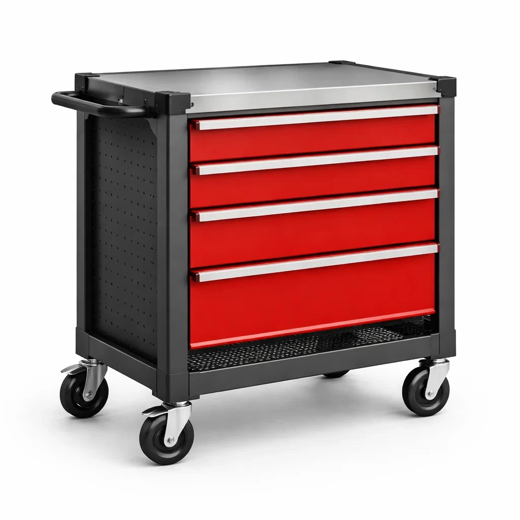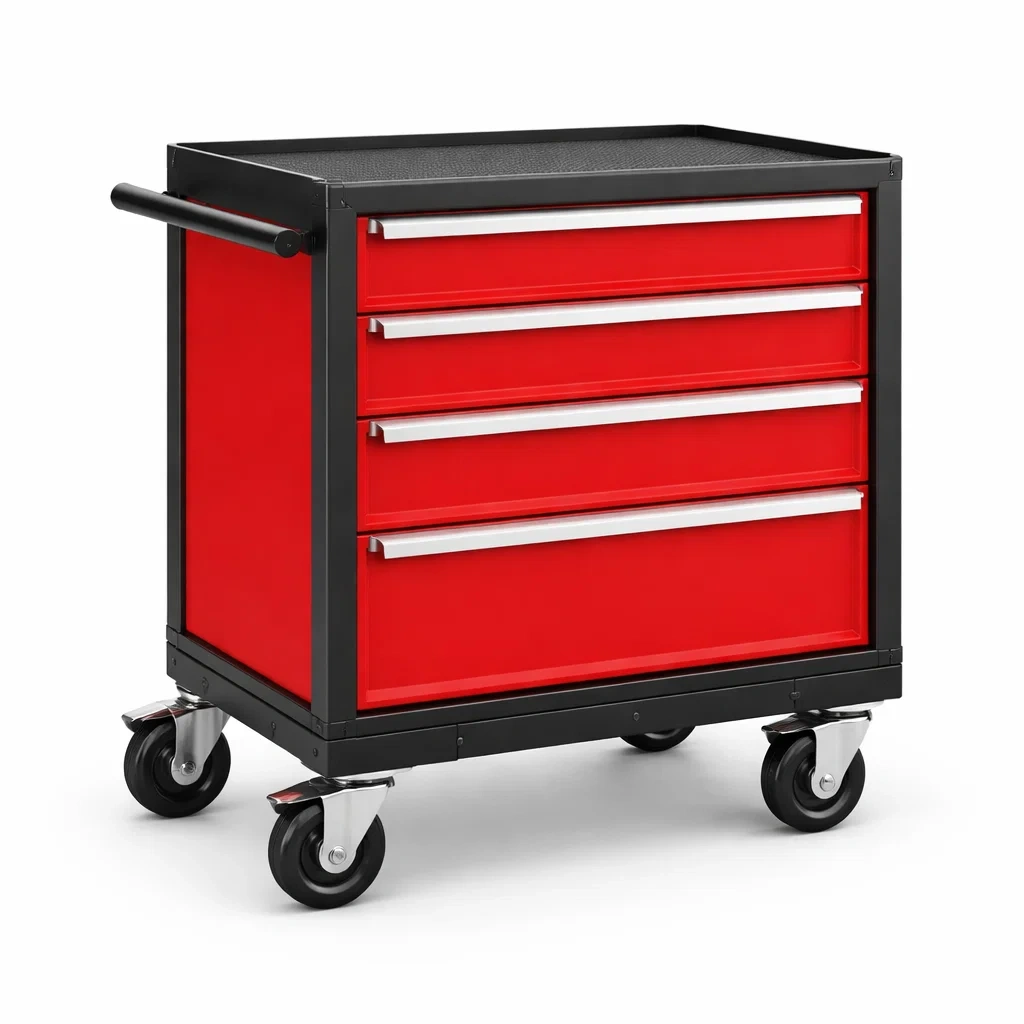 Chariot à outils en métal avec tiroirs et roulettes rouge et noir