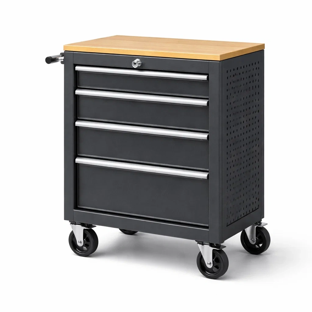 Chariot à outils en métal avec plateau en bois et tiroirs