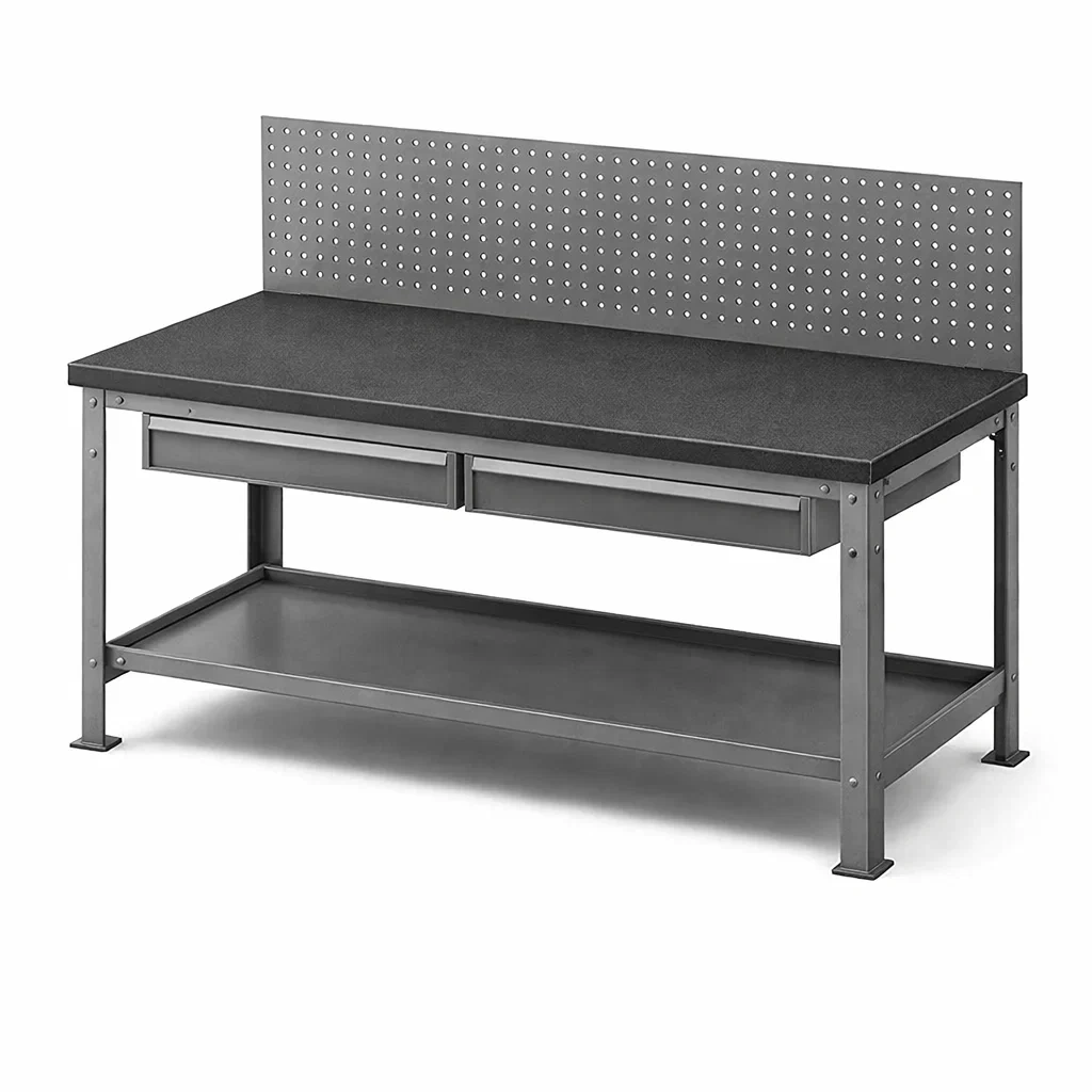 Établi en bois laminé avec cadre en acier et panneau perforé