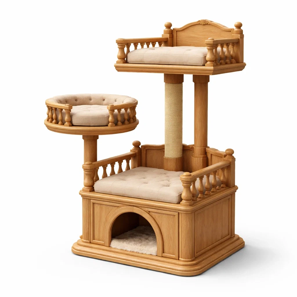 Arbre à chat en chêne massif avec coussins en tissu de lin. Structure à trois niveaux incluant un poteau griffoir recouvert de corde en sisal. Les dimensions sont : hauteur 120 cm, largeur 60 cm, profondeur 60 cm. Poids total de 10 kg.