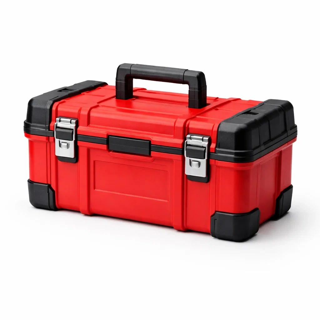 Boîte à outils avec coque en plastique robuste et fermetures métalliques sécurisées.