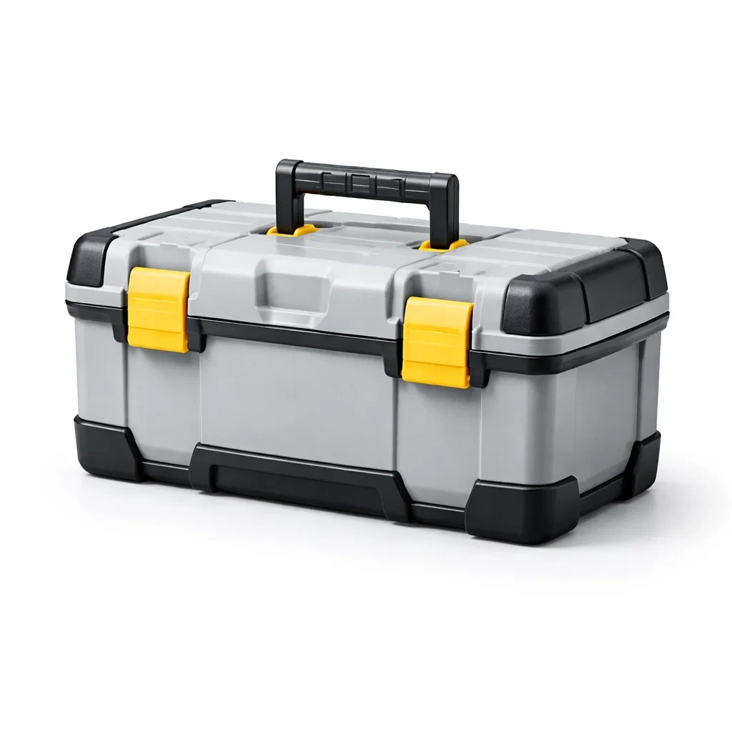 Boîte à outils en polypropylène robuste pour le rangement et l'organisation des outils. Dimensions : longueur 52 cm, largeur 25 cm, hauteur 20 cm. Poids : 2 kg. Couleur principale Gris avec des accents Noirs et Jaunes. Équipée de loquets faciles à ouvrir pour un accès rapide. Nettoyer avec un chiffon humide.