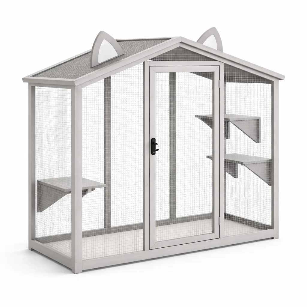 L'enclos pour chat est fabriqué en acier galvanisé avec un grillage métallique offrant une ventilation optimale. Il est équipé de 3 étagères intérieures pour le confort des chats.