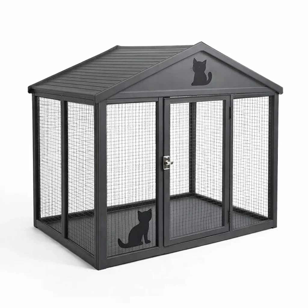 Ce enclos pour chat est fabriqué en métal galvanisé, offrant une structure robuste et durable pour une utilisation en extérieur. La dimension totale est de 120 cm de longueur, 95 cm de largeur et 145 cm de hauteur. Il est doté d'une porte unique et d'un grillage métallique fin pour garantir la sécurité de votre animal.