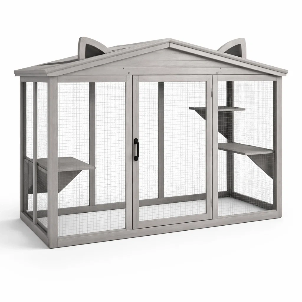 Enclos extérieur pour chats en bois de pin et métal avec étagères intégrées. La structure est conçue pour résister aux conditions extérieures.