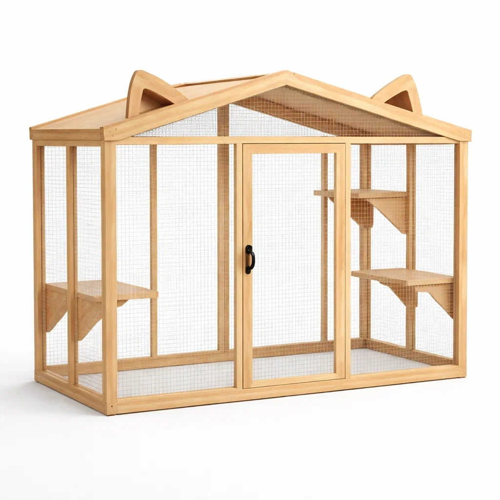 Enclos pour chats comprenant une structure en bois de pin avec un filet en acier inoxydable galvanisé. Dimensions: 175 cm de longueur, 100 cm de largeur, 125 cm de hauteur. Poids net de 28 kg.