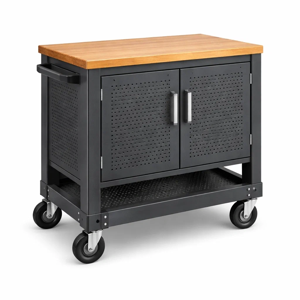 Le plateau est en bois massif, offrant une surface stable et robuste. La structure et les portes sont en acier avec finition perforée pour la ventilation. Les dimensions totales du chariot sont de 76 cm de longueur, 46 cm de largeur et 94 cm de hauteur. Il est équipé de quatre roues pivotantes pour une mobilité facile. La capacité de charge est de 100 kg. L'espace de rangement intégré permet un stockage pratique.
