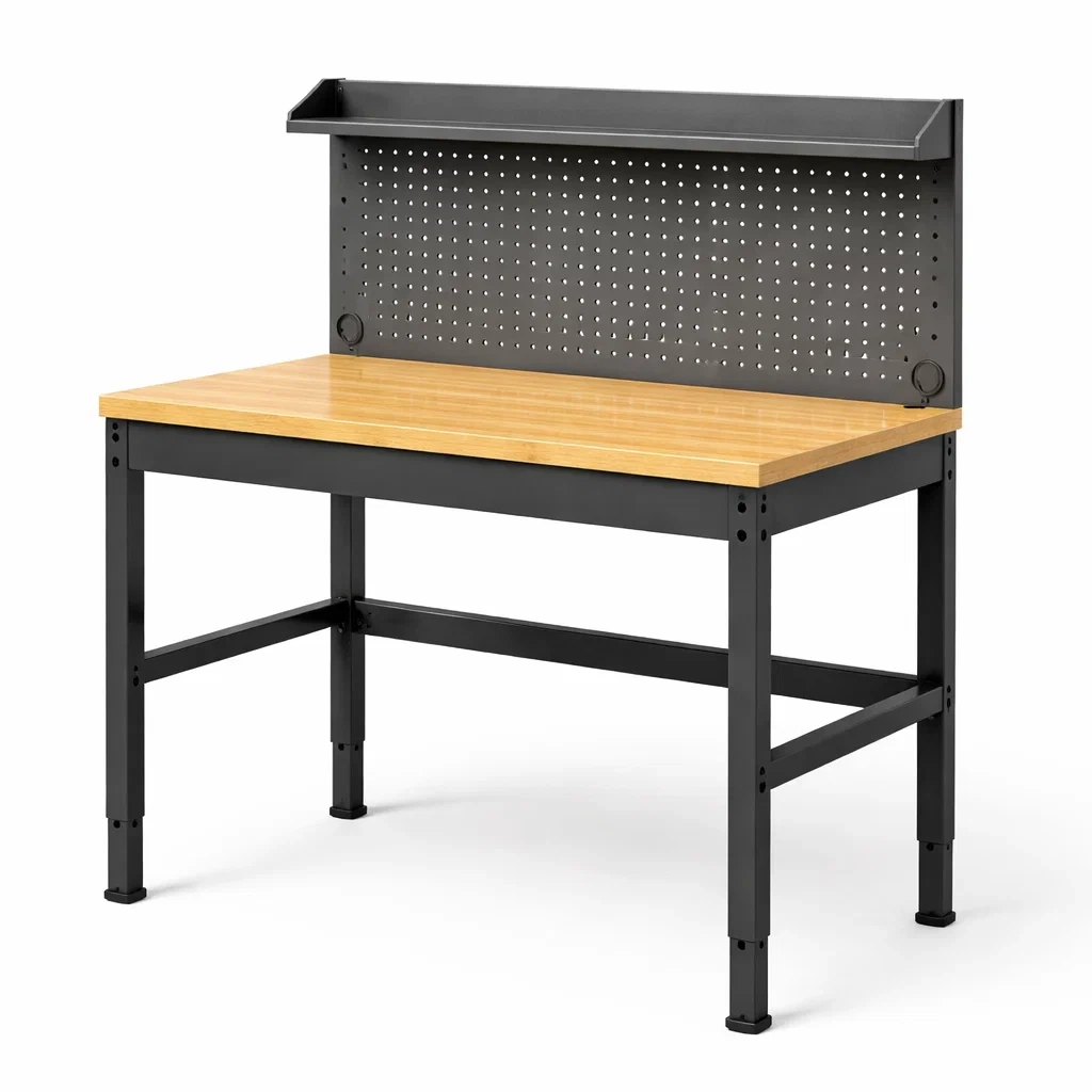 Établi en acier avec plateau en contreplaqué et panneau perforé