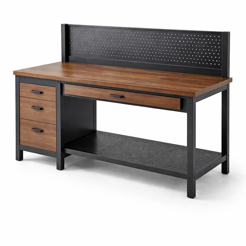 Plan de travail spacieux avec tiroirs de rangement et panneau perforé pour organisation des outils.