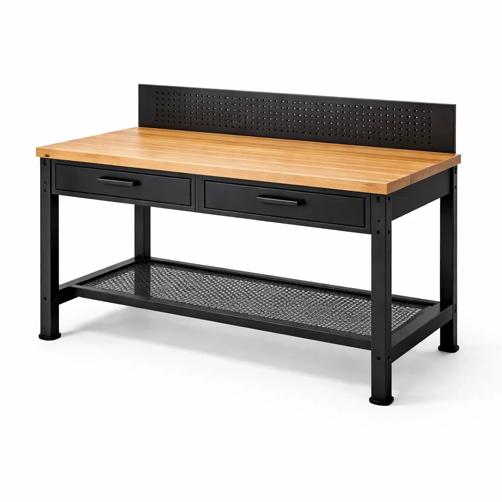 Établi en bois et métal avec tiroirs