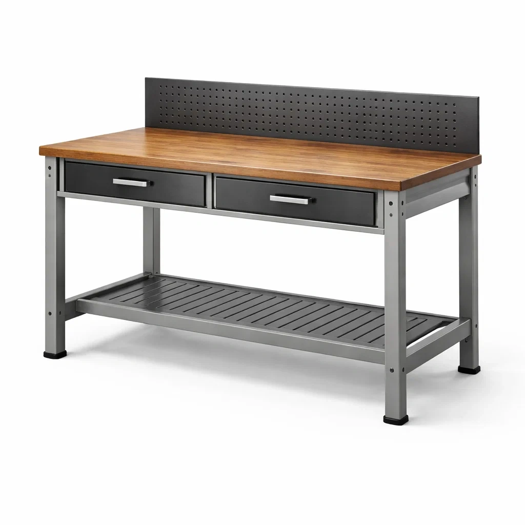 Deux tiroirs métalliques intégrés et tablette inférieure.