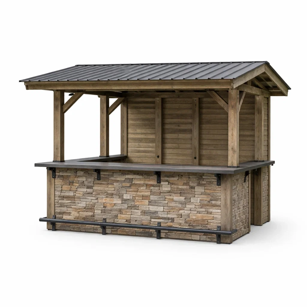 Ce bar extérieur est fabriqué avec une structure en sapin massif, un comptoir en pierre reconstituée et un toit en acier galvanisé résistant aux intempéries.