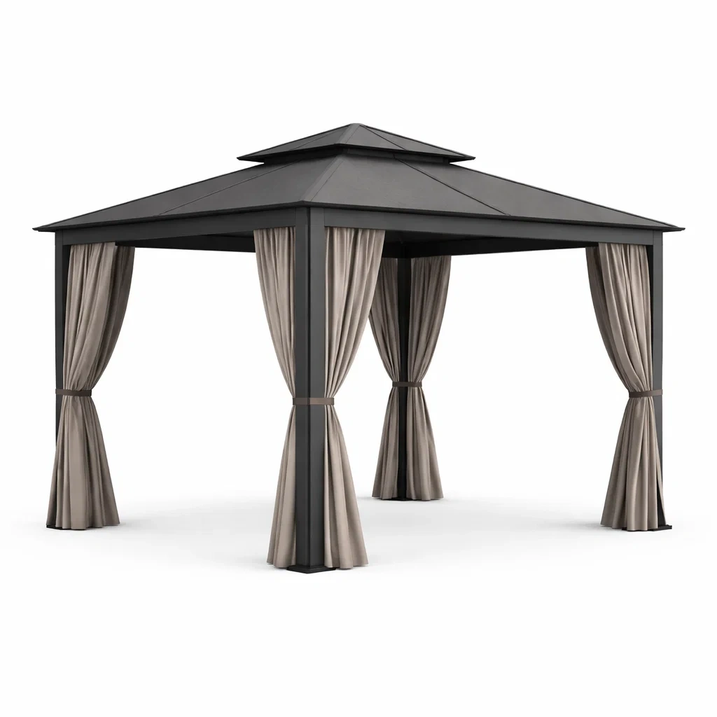 Pavillon en aluminium avec rideaux en polyester noir et beige