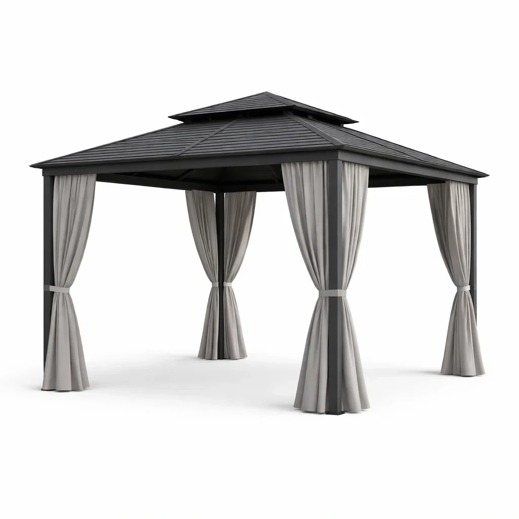 Le pavillon de jardin est doté d'une structure en aluminium robuste et d'un toit en acier galvanisé offrant une bonne protection. Les rideaux sont en polyester résistant aux intempéries pour une utilisation extérieure.