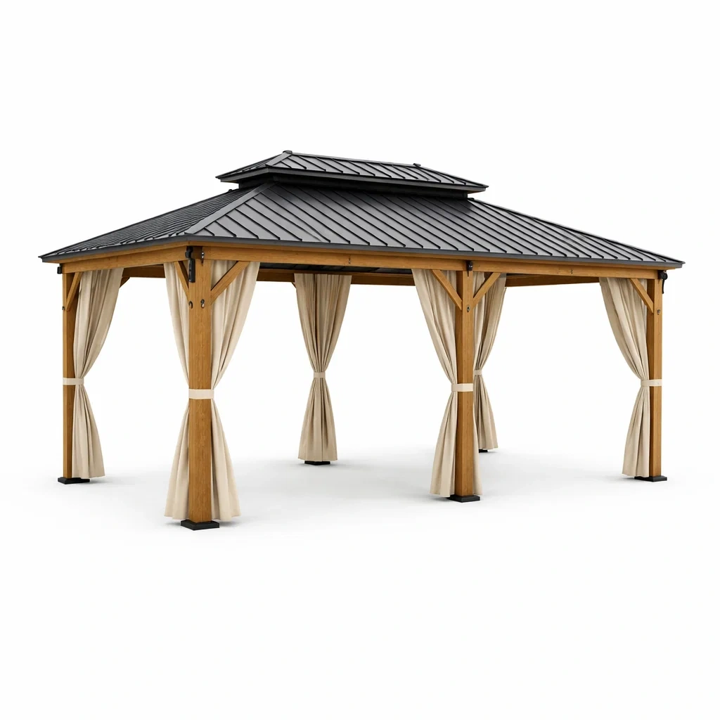 Structure en bois de cèdre avec toit en acier galvanisé. Inclut des rideaux en polyester.